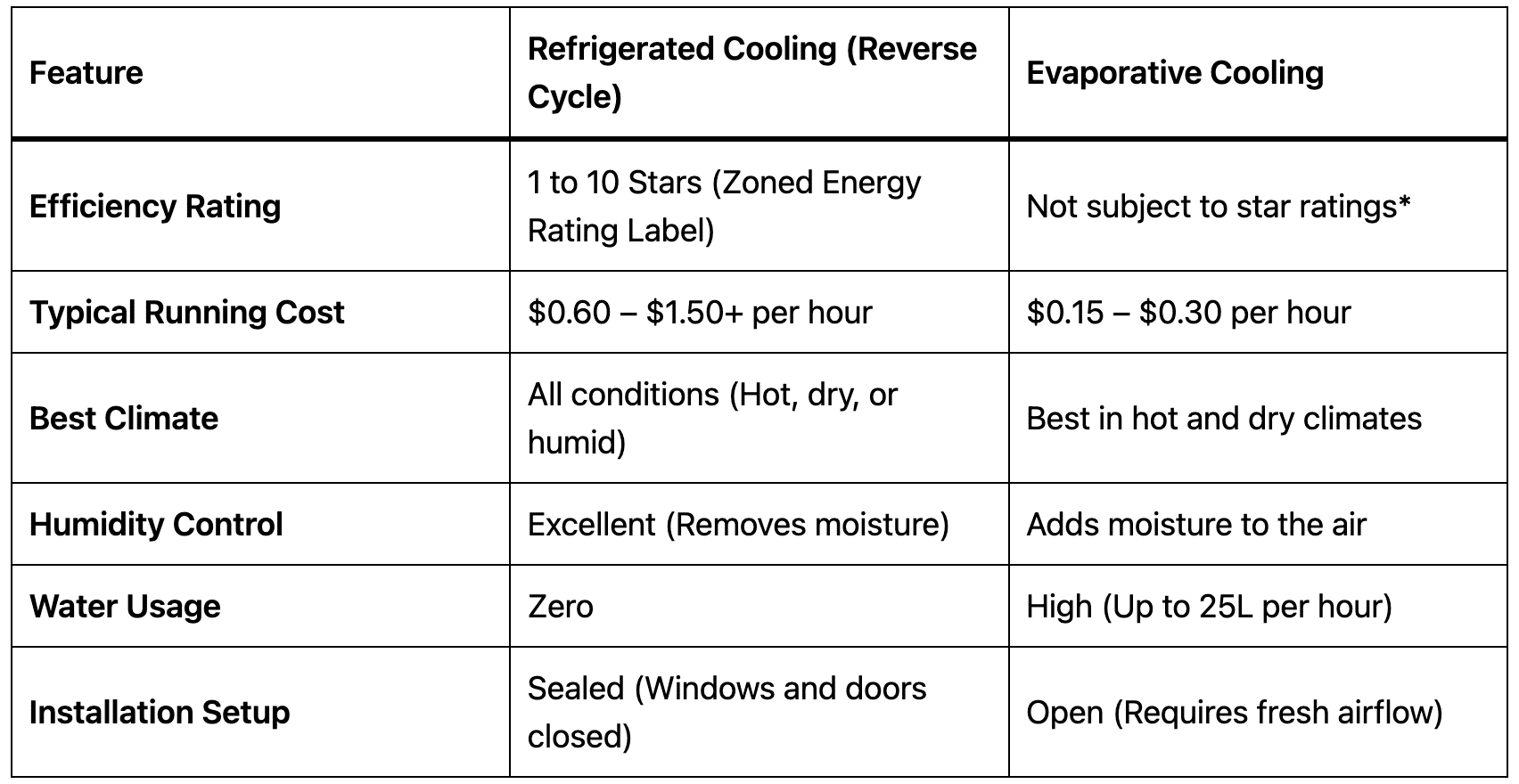 Note: While evaporative coolers do not carry a standard Australian Star Rating, they are generally considered more “energy efficient” in terms of raw electricity consumption. However, this must be balanced against their water usage and reduced effectiveness on Melbourne’s rare humid days.